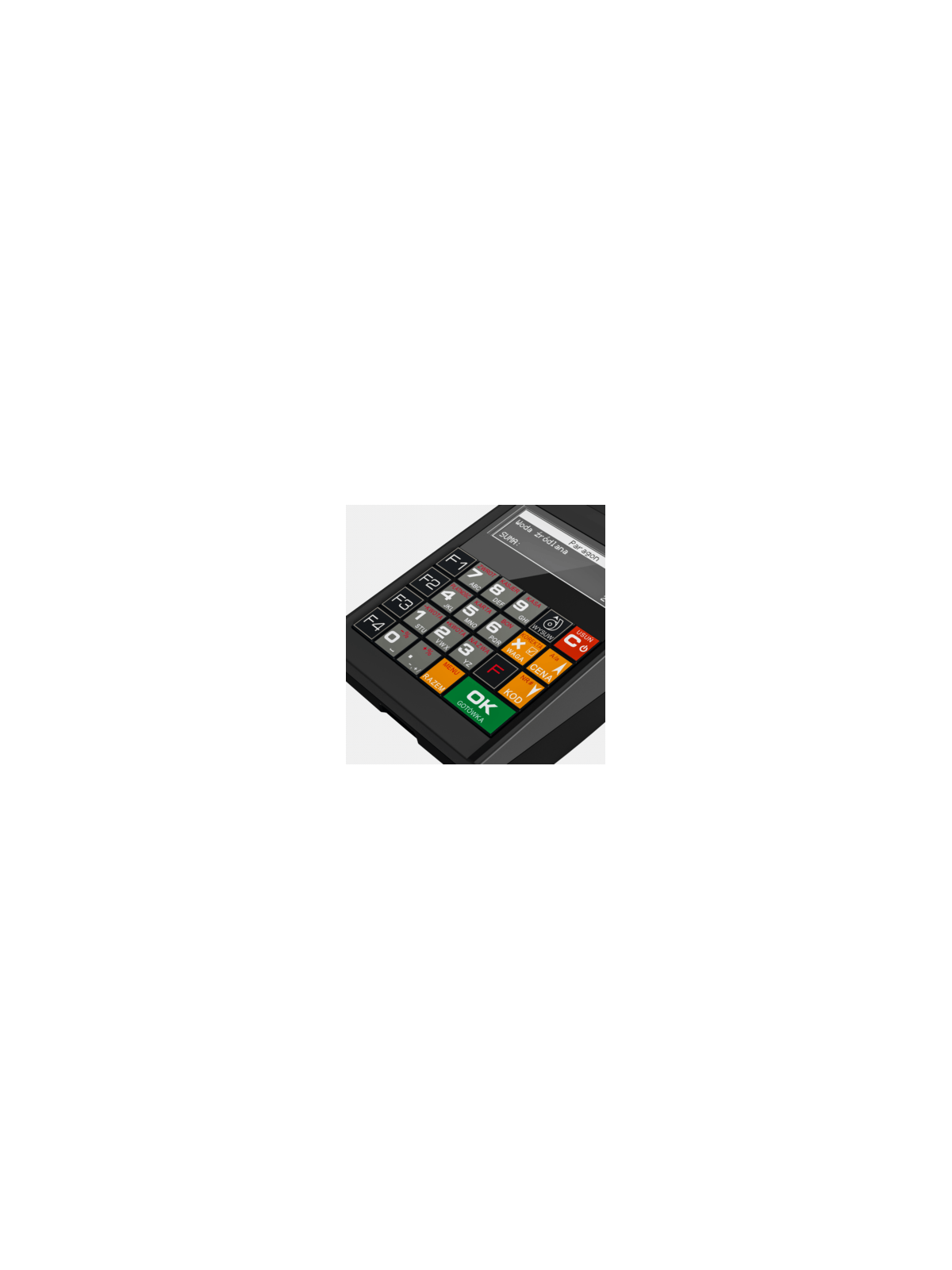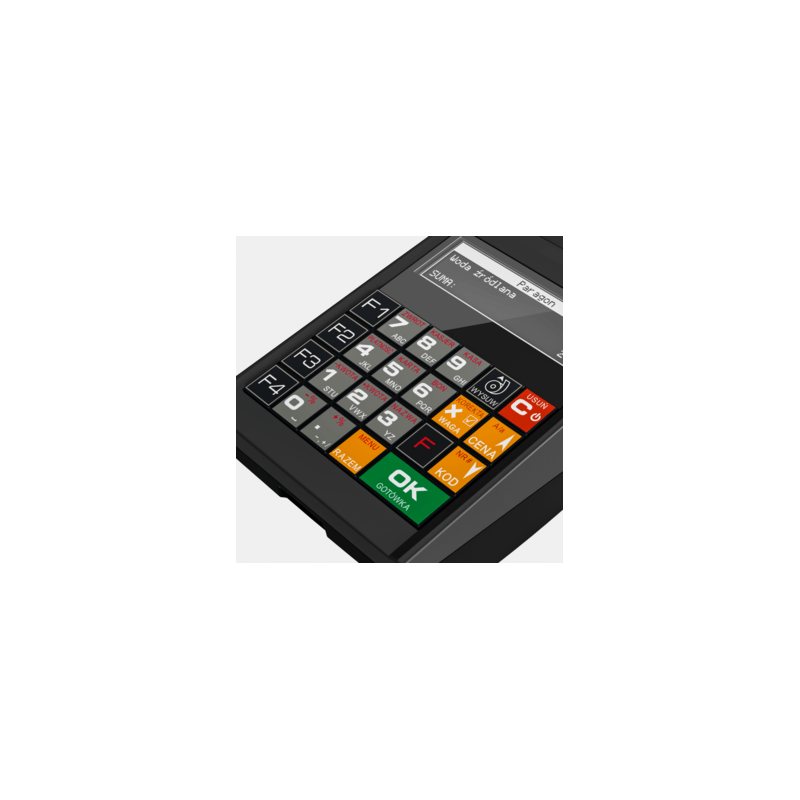 Klawiatura wyposażona jest w 4 klawisze funkcyjne F1 - F4, które w dwóch płaszczyznach mogą być oprogramowane jako klawisze szybkiej sprzedaży lub skróty do poszczególnych funkcji kasy (konkretnego raportu, programowania, opcji, itp.).
