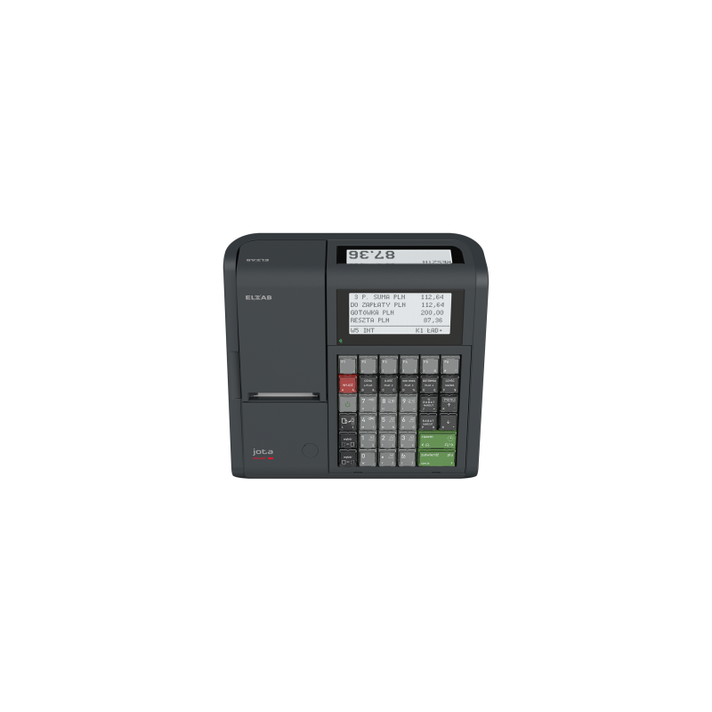 Kasa ELZAB Jota ONLINE to niezawodna kasa fiskalna wyposażona w trwałą klawiaturę mechaniczną oraz 4-liniowy wyświetlacz kasjera. Konstrukcja oparta o sprawdzone, zaawansowane rozwiązania systemowe modelu ELZAB Jota z kopią elektroniczną. Przeznaczona do pracy w sklepach spożywczych, mięsnych, cukierniach, piekarniach, małej gastronomii, szczególnie tam, gdzie możliwa jest praca w sieci LAN/WAN. Posiada podtrzymanie akumulatorowe, może również pracować zasilana z gniazdka zapalniczki samochodowej.